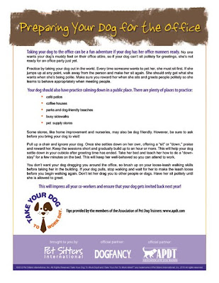 And for those of you who are going to be spending the day with your canine at the office, here are some great tips provided by members of the Association of Pet Trainers. (Click on image to make larger).