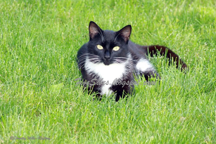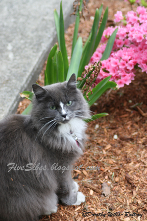 So the story of our kitties goes like this. Over three years ago, a starving and frightened long-haired gray kitten (a/k/a the honorary Husky cat), whom we named Smokie, sauntered by our house and met my daughter who immediately felt sorry for the beautiful, although very skinny stray. She fed her some salmon, and well, as they say, the rest is history! She never left us. I had checked the lost and found in the papers, the announcement board at the vet's, called several other area vet's and the SPCA to see if there were any reports of a missing cat fitting her description, but I knew sadly that she was not lost. She had been abandoned. I said at the time, if she was still around in a month, we'd take her to the vet's and get her a rabies shot and a check-up to start, and give her a name tag. She was still here. Turns out, she was just shy of about a year old and altered, confirming that she once had hu-parents, but was indeed abandoned. I then said if she was here in three months, we'd go back for the rest and put her on flea and tick preventative. That was over three years ago! Smokie is such a sweetheart and real lovebug, how could anyone just dump her off??? She loves to sneak into the backyard and torment the Sibes by perching herself on the fence, or slinking her way through the yard below their deck. She absolutely owns the front yard. And she comes running when you come home, greeting us with purrs and rubs.