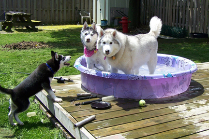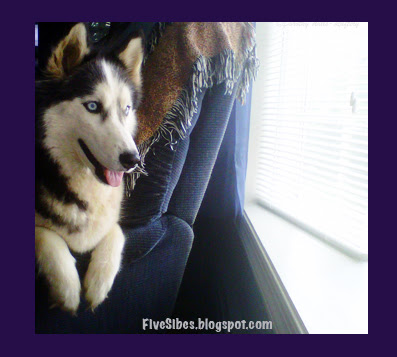I have to say it's quite a trip to listen to them as they are bathed, blown dry, clipped, and pedicured. Each one brings their own personality to the experience. Harley, our alpha queen, wife to Gibson, and the pups' surrogate mother, morphs into Cruella DeVille, baring her teeth in such a deadly manner, she has to be muzzled. Chloe cries, cries, and oh, did I mention, cries? Wolf woos and aroos his way through it all. Bandit takes it all in quiet stride (which is strange since she is our high-energy, easily distracted Sibe!), while Gibson tries to lay down while he's being bathed and when he's being blown dry. Oh, he also tries to lay down while getting his nails clipped, oh, yes, and while he gets his legs and underbelly buzzed too. Our groomer (who does house calls) is just wonderful with them. He laughs and talks to each through it all, and I think other than the whole "bathing" aspect, they really enjoy his one-on-one attention.