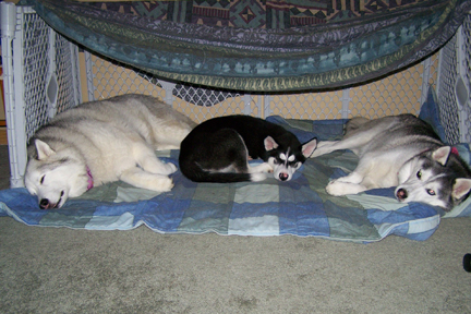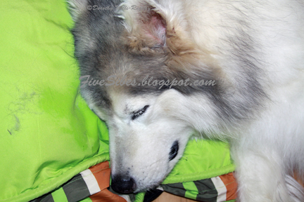 Did I mention we also had snow "furries" here even though it was in the high 80s? And the Five have only just begun to blow their coats! But I'm guessing Husky owners across all the warmer climates are experiencing those very same furries too! And yes, that IS a water dish buried under that "snow!"Naturally, all that brushing, and bathing, and splashing water, and blow drying, and primping really can exhaust a furkid. So what's the best thing to do after such strenuous activities? Why laze around in the nice cool A/C on some new summer beds, what else?!