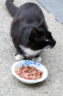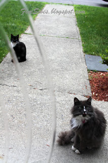 Then one night two weeks ago, she brought home a little, extremely frightened kitty friend. My daughter joked that "Smokie has a boyfriend." Just like with Smokie, she began feeding and talking to the kitty we now call "Binx." Each day, Binx comes a little closer to us. Same deal as Smokie, if he's still here in two more weeks, off to the vet's and shots and a name tag! (Hopefully we can touch him then as he's been so skittish, although he reached out to playfully paw my daughter's hand today! Big step! I'm hoping Binx will adopt us, just like Smokie did!