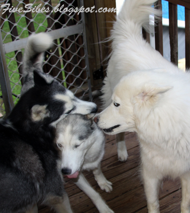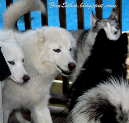 What's five Siberian Huskies to do when the main yard has been off limits due to being under construction for a deck extension for over a month? Throw in too many incredibly hot days with heat indexes over 105 degrees Farenheit, and exercise has been pretty much limited to lounging on the deck, chomping on the deck rails, splashing in the pool, making their own entryway from the deck into the house via a six-inch space next to the a/c in the dining room window frame, chewing the trim off the back door, chewing the aluminum siding on the back of the house, finding and chewing up stripped pine cones, bringing rocks on the deck, chewing up the mail on the kitchen table, sitting on top of the kitchen table, chewing on the window blinds to get a better look at Mr. Contractor, sleeping in the air conditioned house, and rolling over to a different snooze spot in the air conditioned house. Summer can really zap a Sibe's energy.