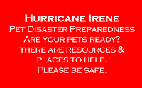 Hurricane Irene Information Reminder: A good source to keep checking for hurricane tracking, pet-friendly shelters, willing foster care, and other pertinent information is the Hurricane Irene 2011 Animal Rescue Resource Page. Please see yesterday's blog entry for tips and other important resources. Be safe everyone.