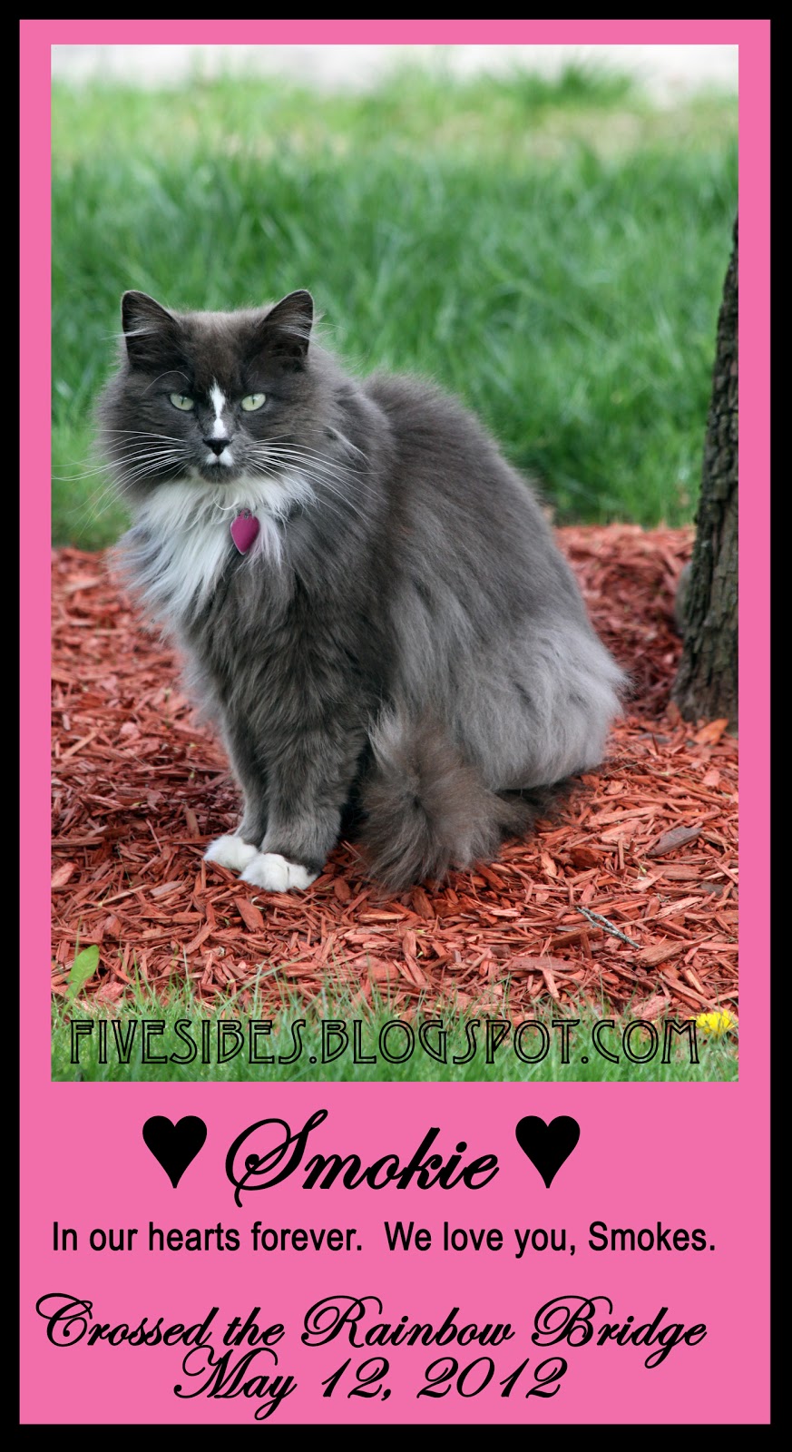 We want to sincerely thank Gwen, a total stranger, for her kindness and compassion for stopping to help our baby and offering her comfort in her final moments here on Earth, and a heartfelt thanks to our wonderful vet and staff for trying to save her and helping her to have a peaceful journey. Smokie is now at the Rainbow Bridge, and we take comfort in knowing our other furangels are there to welcome her.