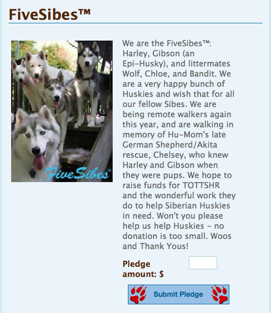 To make a pledge in our name, please go HERE and be sure to look for the photo of the FiveSibes™ and you can make a donation right through PayPal that goes directly to TOTTSHR. On behalf of all of the Huskies TOTTSHR helps, "Woos" and "Thank Yous!"