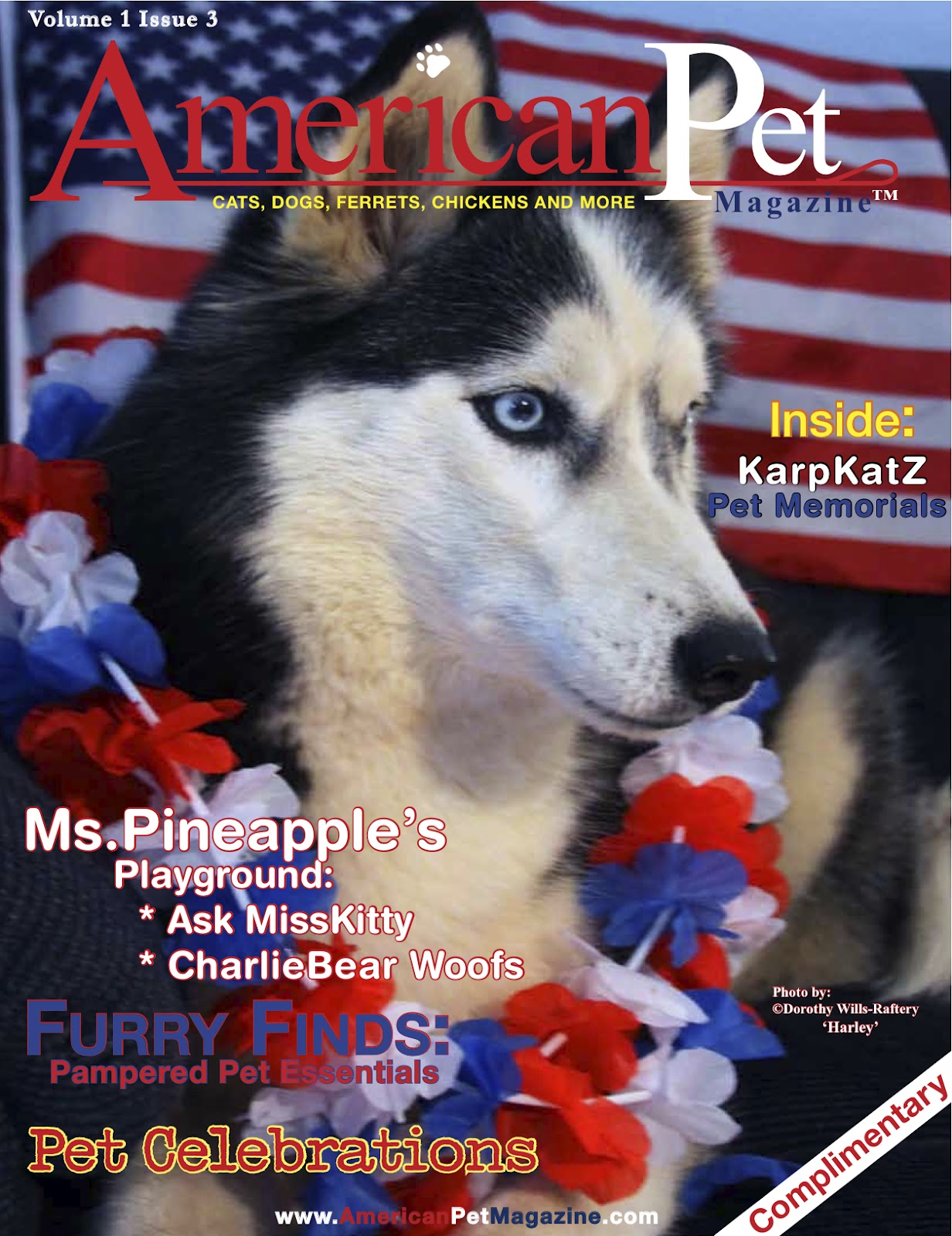 If you haven't checked out this fairly new online magazine (they debuted last summer and currently have three issues in their first volume series), you must do so! It is full of great pet articles and helpful information on dogs, cats, horses, fishes, ferrets, and more! Now, I'm not singing this publication's accolades because I am a contributing writer and photographer, I'm saying it because it really is super magazine jam-packed with info and articles in each issue. Publisher Suzin Karp, along with her four-legged staff of GypsyPrince, MissKitty, and PeanutButter, have brought pet owners a valuable resource delivered in between the virtual pages of this magazine. Ad space is also available, and Karp says in her debut issue, "American Pet Magazine is a new resource to help you and your pet live safely and confidently. I encourage you to support the advertisers and pass along this complimentary copy. A percentage from every paid advertiser will be donated to no-kill shelters, rescues and events. Together, we’ll help save lives, One pet at a time. One day at a time. One life at a time!! Join our cause for pets!"
