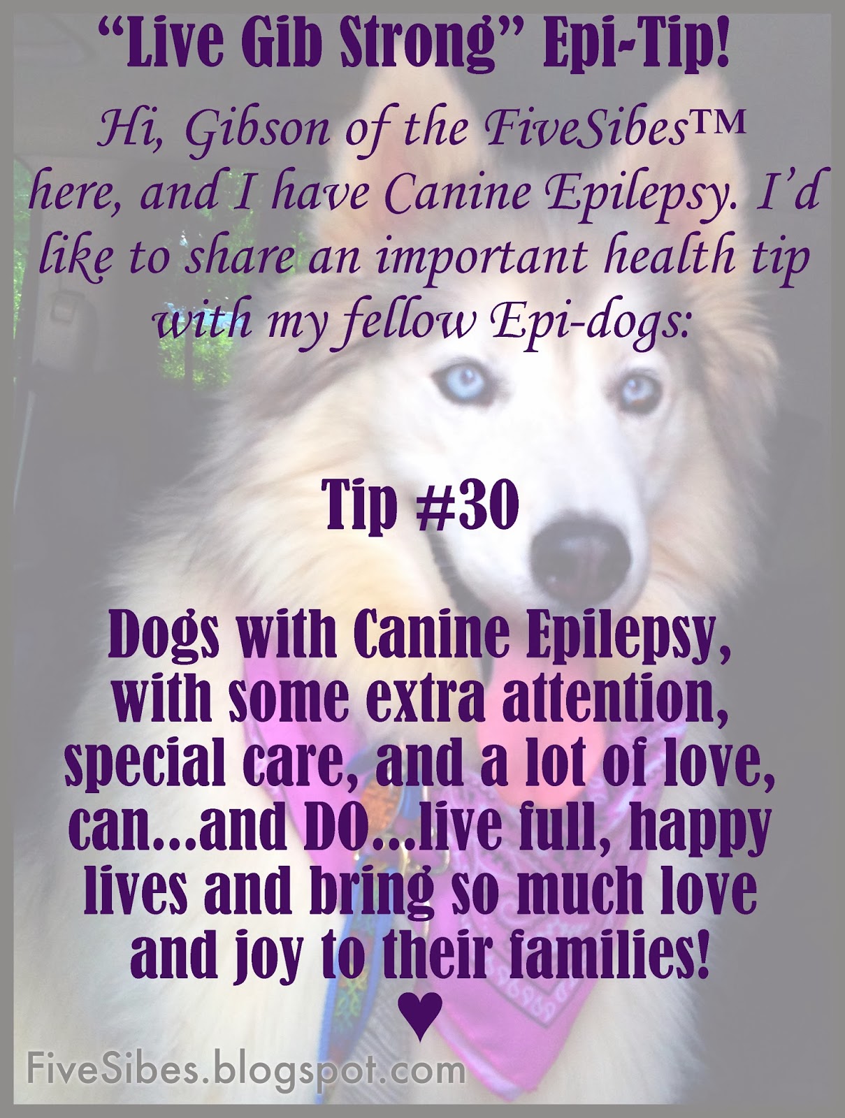 While today marks the last day of November and National Epilepsy Awareness Month, and our last daily Epi-Tip, we hope every day is an awareness day for Canine Epilepsy. We thank you for joining us in our "Live Gib Strong" K-9 Epilepsy Awareness Campaign. Spread the word that not only can Epi-dogs live full and happy lives (for however long we are blessed to have them)...there is much support and many information resources available to help parents, fosters, and rescues of dogs with Canine Epilepsy or seizure disorders. And be sure to check out our original post for fundraisers to benefit Canine Epilepsy Resources and The Wally Foundation, two of our "The Sibe Vibe" Dog Works Radio show broadcasts where we talk all about Canine Epilepsy, and a drawing for "Gibbie Snacks" delicious treats by House Wolf for FOUR lucky winners...plus...bakery cookies for the hu-family! Visit HERE for details! Hurry though...today is the deadline!