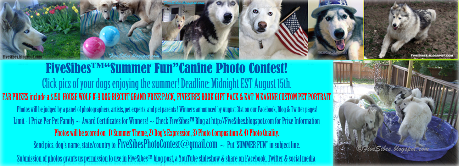 We'd love for you to follow (if you don't already) our blog here, our FiveSibes: Siberian Husky K9 News & Reviews page, and our Twitter page (@FiveSibesMom), if you can, to keep up on lots of contest, Husky, and K9 news!