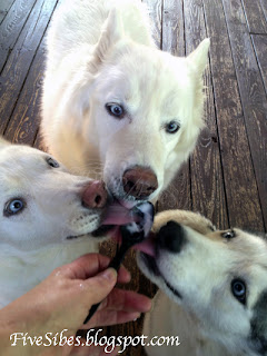 We think it's Dog Day here everyday! But, the Sibes are happy to have it be a canine "holiday"! Did you do anything special to celebrate? The FiveSibes slept most of the day as it has been pouring rain here...but they did get some yummy treats, too! What better way to spend a holiday than eating and relaxing?