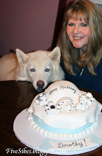 What a wonderful surprise I received today from my hubby, daughter, and the Sibe kids...the best, most beautiful Birthday cake everrrr! It was a custom-made FiveSibes Birthday cake from our local bakery complete with fondant replicas of Harley, Gibson, Wolf, Chloe, and Bandit! It was way too pretty to eat...but, after many hours of admiring it and taking lots of photos...we did eat it...But...not until after I safely removed each and every fondant Husky and carefully placed them on a plate until I can get to the craft store and purchase some shellac to preserve them and place them in my curio cabinet with my other Husky collectibles!
