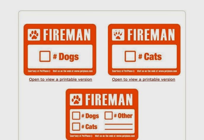 You can also upload a printable fireman pet alert decal from PetPlace.com with directions HERE. These can be printed (ink jet printer) onto paper or onto (preferred) clear decals for windows you can purchase at most office supply stores. See sample downloadable decals below: