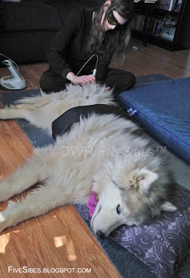 On and off over the years, Gibson has been faced with setbacks as a result of his meds, and then he had a fall on the ice and went lame. Again, we attacked full steam ahead with Conservative Care (under the direction of his vet team, we opted to treat Gibson via this method as with his being an Epi-dog, the least amount of surgeries, the better to avoid break-through seizures, and I was very positive going in using as much holistic measures to help heal him as I could).