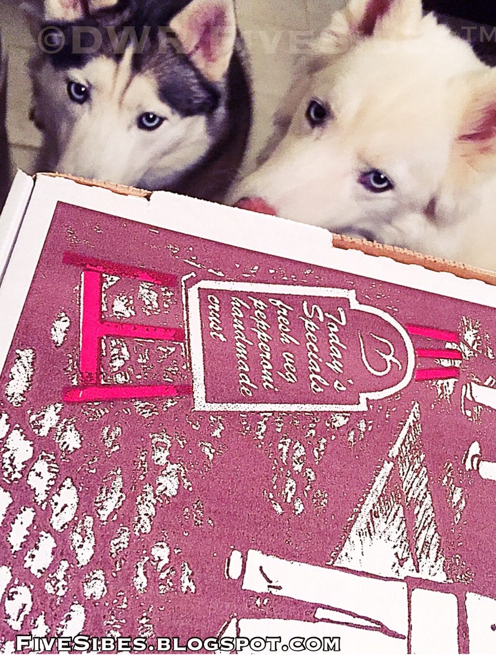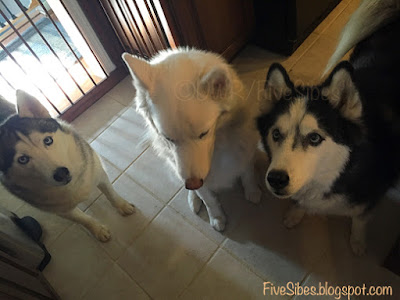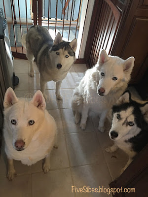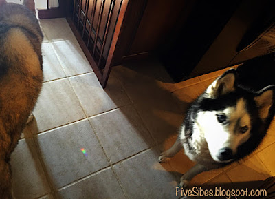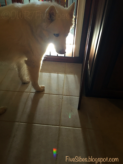 This morning, as I was bringing in the remaining FiveSibes from the back deck, I called out, "Happy Birthday, Gibson" into the cool morning air. I then brought the Huskies in and they all gathered together for breakfast, as they do every day, I told them it was Gibson's birthday. I broke up a dog cookie for them to each have a piece in his honor, when suddenly I noticed a rainbow spot on the floor by their paws...right in the area where they all gather for their meals...the same area Gibson would be in with them...