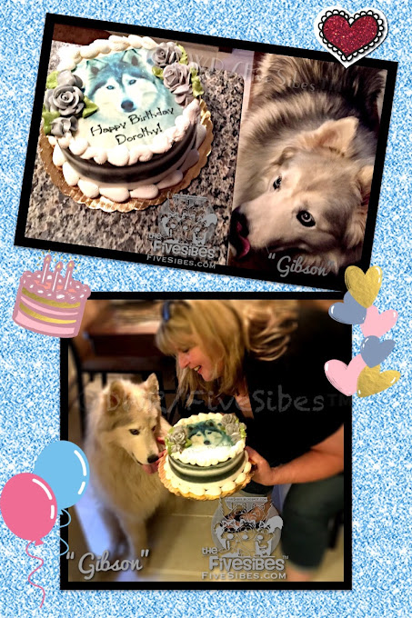 They totally surprised me with this beautiful cake complete with a portrait of my beloved heart dog, Gibson, on the icing! It was truly a work of art! The cake was so pretty, for a moment, I thought about saving the top! (Confession time: a few years earlier they had a custom cake made with five fondant Huskies on top, and while they eagerly waited to eat the creative sweets, I did not let them because, yup, I saved them! Even sprayed those delectable Huskies with clear acrylic! They are still proudly perched in my curio cabinet)